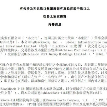 #李嘉诚拟228亿美元卖掉43个港口# 【李嘉诚旗下长和拟向贝莱德财团出售大部分港口 巴拿马港口亦列其中】#长江和记拟退出巴拿马港口# #长和暴涨24%# 长江和记实业有限公司4日深夜在港交所发布战略重组公告,宣布与贝莱德牵头的财团达成原则性协议股票杠杆投资股市里的杠杆,出售其全球港口业务核心资产,包括巴拿马两个港口的权益。该财团成员包括贝莱德及其全球基础设施投资合伙企业(GIP)、地中海航运旗下码头投资公司(TiL)。